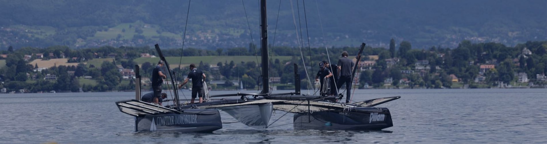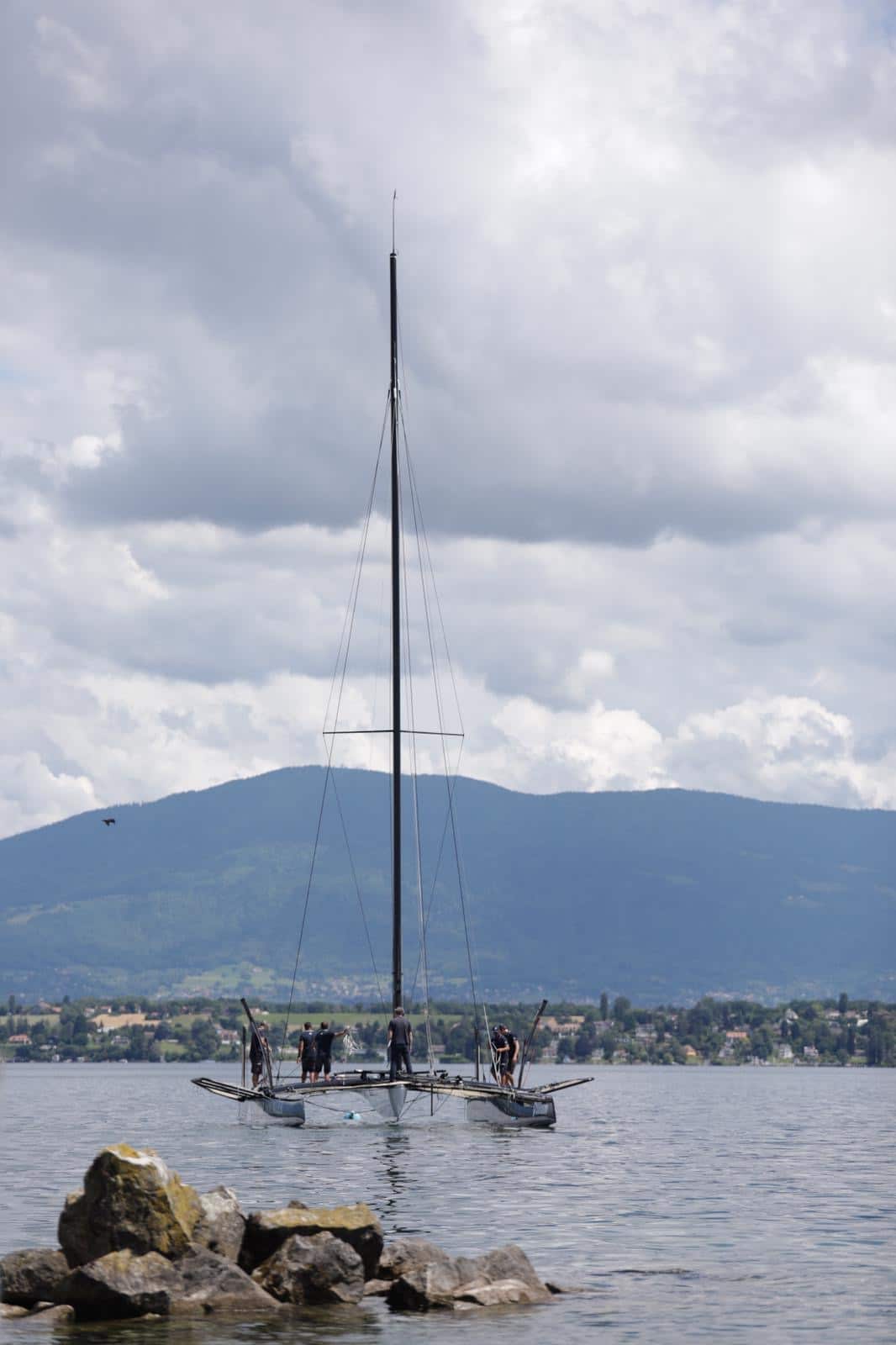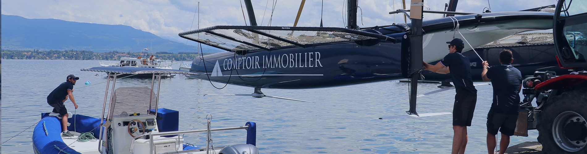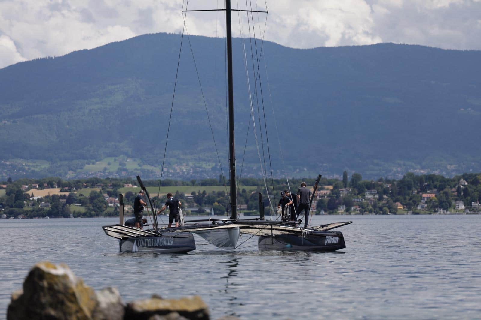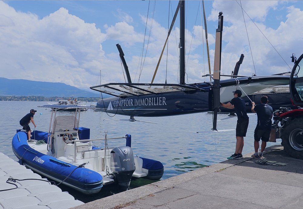 Une fois prêt, le bateau, posé sur des chariots à roulette spécialement conçu, a été poussé sur le terre-plein par l’équipage. Il a ensuite été suspendu au petit camion-grue piloté par Nicolas Rossier le patron du chantier naval SUI 46°16, où la plupart des TF35 sont assemblés. Une fois soulevé, l’engin a roulé sur les derniers vingt mètres qui séparent le terre-plein du quai avec le catamaran suspendu au bout de sa flèche. Les membres de l’équipe se sont positionnés autour du bateau avec des amarres prêtes, et la descente dans l’eau a pu commencer. Une fois à flot, Téva a vérifié l’intérieur des coques pour s’assurer qu’il n’y avait aucune fuite, avant de décrocher la grue. Le bateau a ensuite été amarré à son tender (canot moteur semi-rigide). Thierry a pris le commandement de la manœuvre pour rejoindre la bouée d’amarrage située à une centaine de mètres.