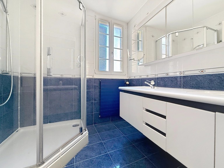 The bathroom is equipped with a large shower and double washbasin, offering appreciable comfort on a daily basis.