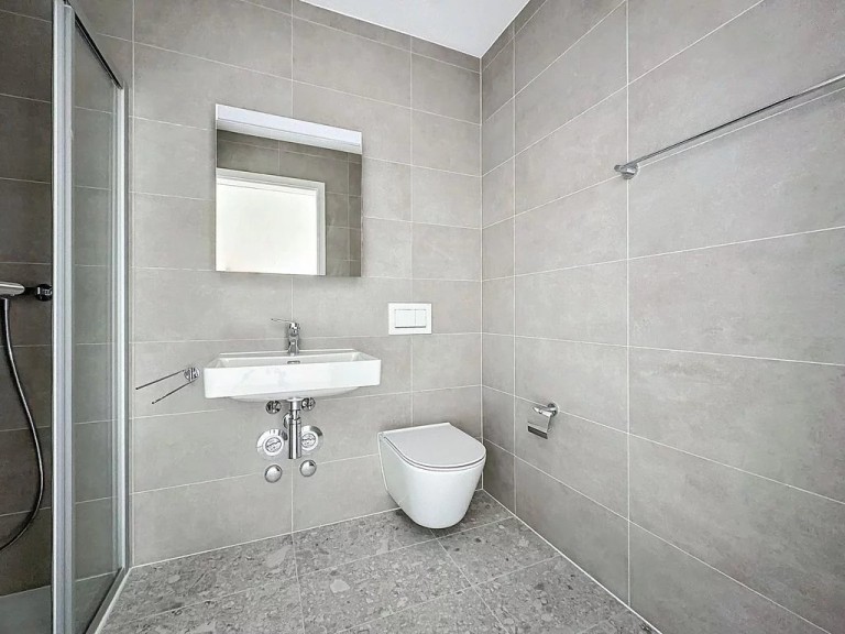 – Contemporary bathroom with walk-in shower and washbasin.