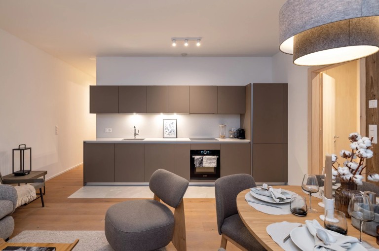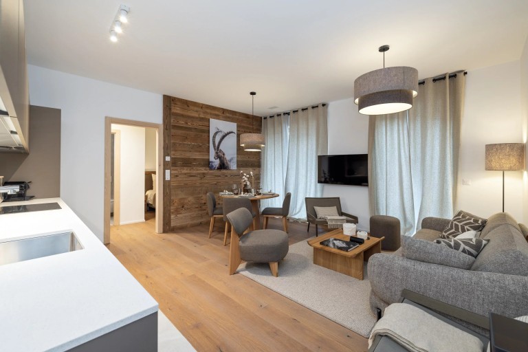 The residence provides a full range of hotel-style services: ski valet, concierge, room service, and spa – all within a contemporary architectural design enhanced by alpine charm.