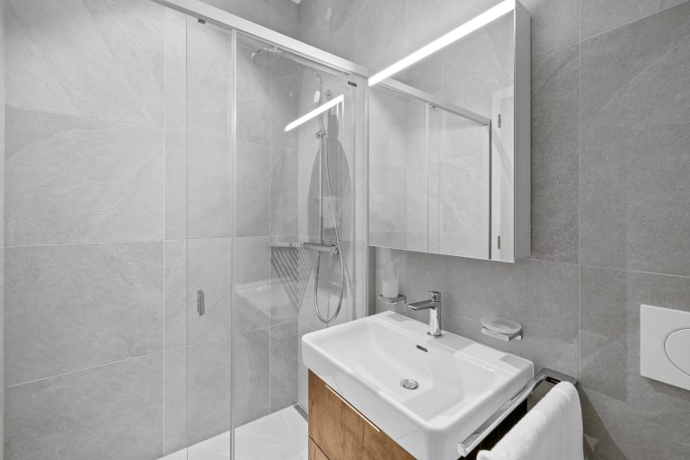 This 69 m² high-ceilinged apartment features a south-facing balcony accessible from both the living room and the bedroom. Warm and filled with natural light, the 27 m² living area with open-plan kitchen includes a bathroom with shower and toilet, as well as a comfortable sofa bed that can accommodate two additional guests. The spacious and cozy bedroom has its own private bathroom.