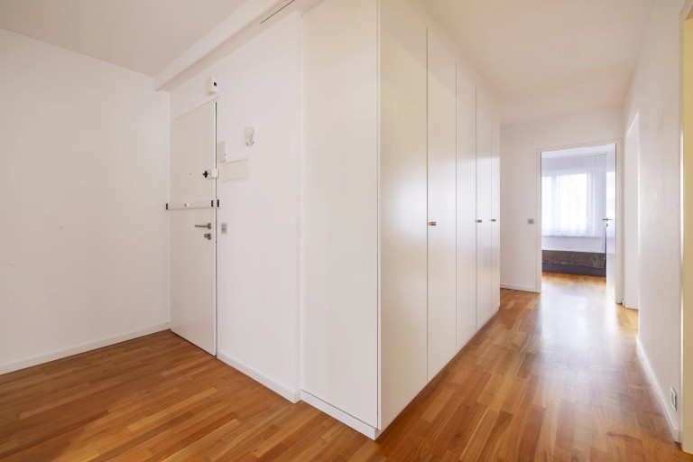 The apartment has three bedrooms, two shower/w.c. rooms and a private laundry room integrated into the kitchen. Numerous spacious wall cupboards provide practical storage space.