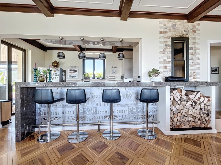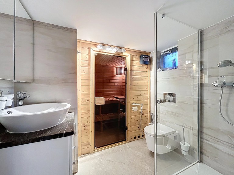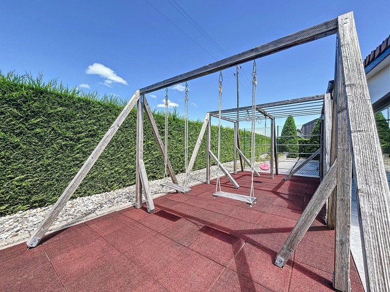 With 225 sqm of living space spread over three levels, the family home offers 3 to 4 bedrooms, just as many shower rooms, a living room opening onto the dining room and kitchen, not forgetting the winter garden, which is pleasant all year round. A gym, music room and sauna are located on the lower ground floor. As for the large terrace, it lets you soak up the sun all day long by the jacuzzi and pool, not forgetting the children’s play area.