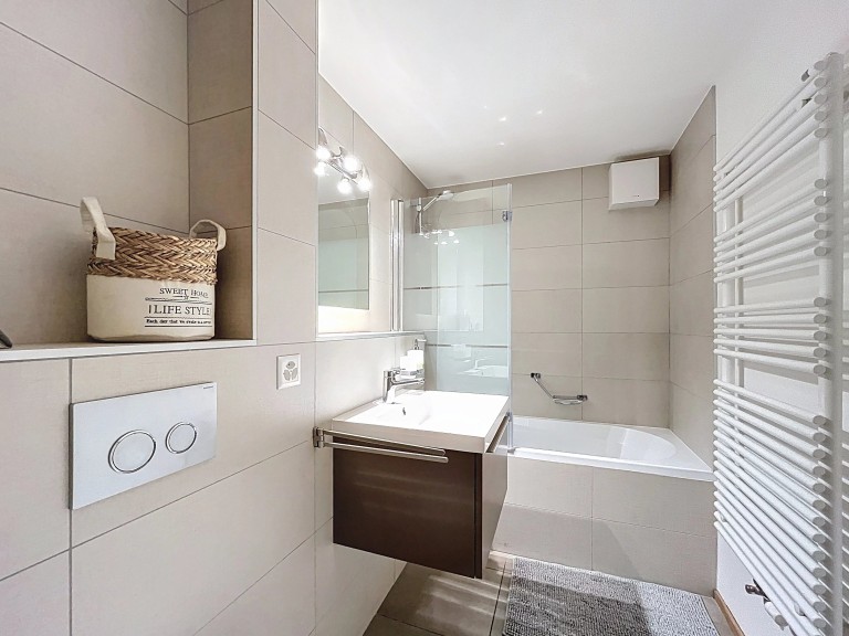 On the first floor, a vast living/dining room with fireplace opens onto a south-east oriented terrace and the pool. A top-of-the-range open-plan kitchen is extended by a veranda with walls that can be removed in summer days. An Argentinean barbecue adds a touch of convivialilty.