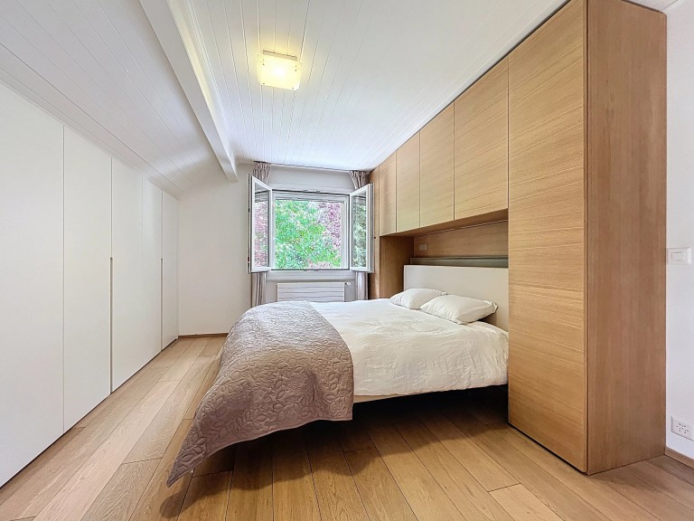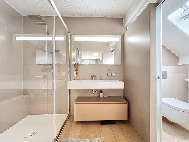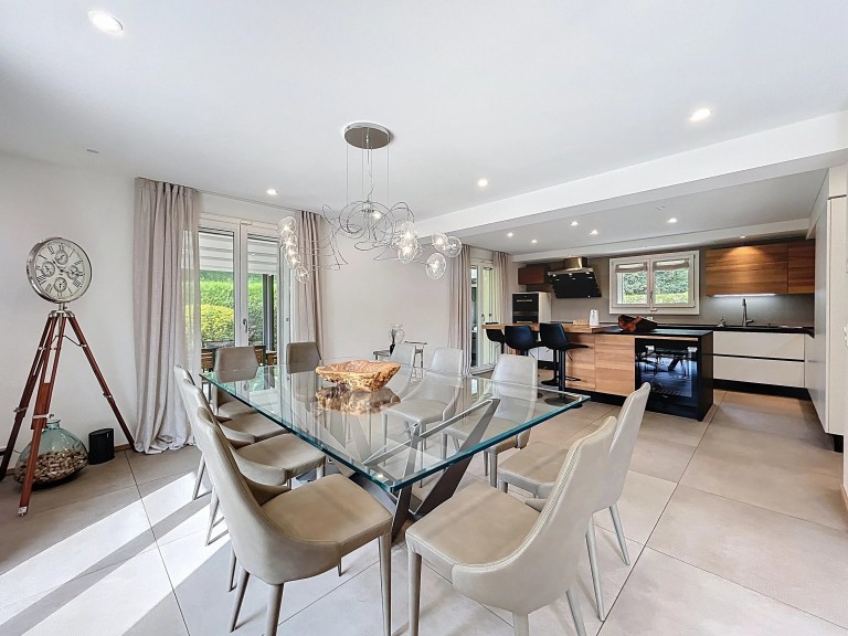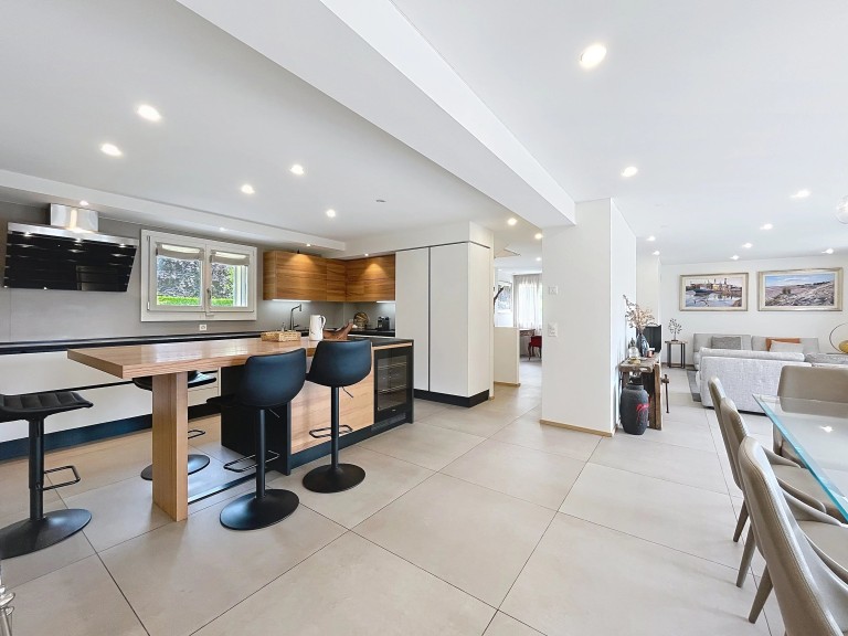 Located in the heart of a quiet residential area between Lake and Jura, 5 mn by car from Nyon and 10 mn’ walk from Ecole Moser and Signy shopping center, this bright villa of Vaudois architecture, completely renovated in 2016 by an interior designer, offers high-standard finishes and a contemporary design.