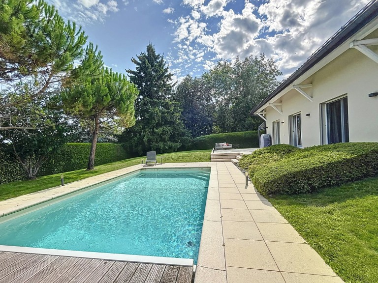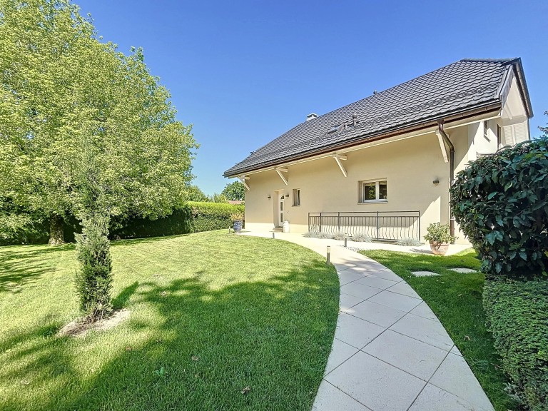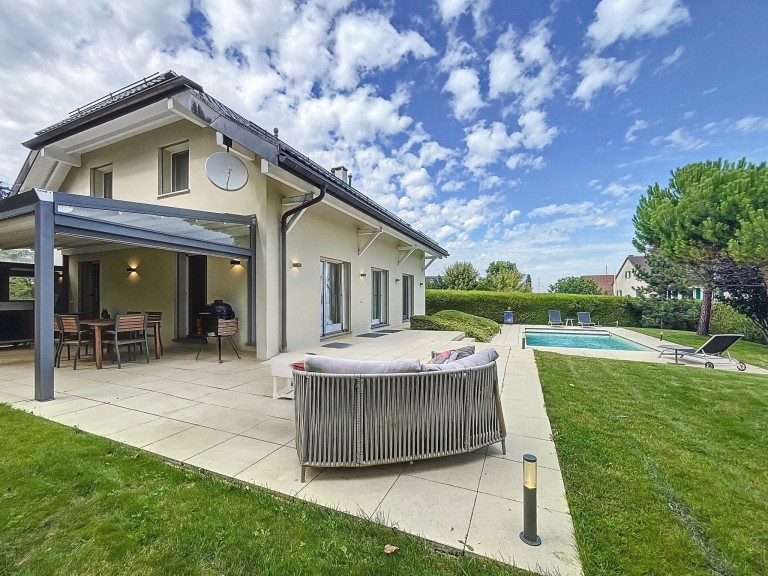 The garden, fully fenced and equipped with an automatic watering system, boasts a swimming pool heated by solar panels facing Mont Blanc, as well as a south-east-facing terrace for optimal sunshine. The villa also features a double garage with large built-in cupboards.