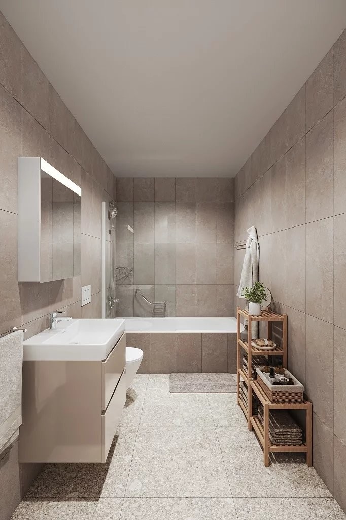 – Salle d’eau moderne avec douche et colonne de lavage (lave-linge + sèche-linge)