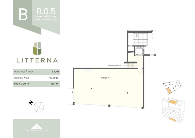 Mit 106,5m² und einer Raumhöhe von 3,56m bietet sie maximale Gestaltungsfreiheit – ideal für Showroom, Geschäft, Büro und vieles mehr.