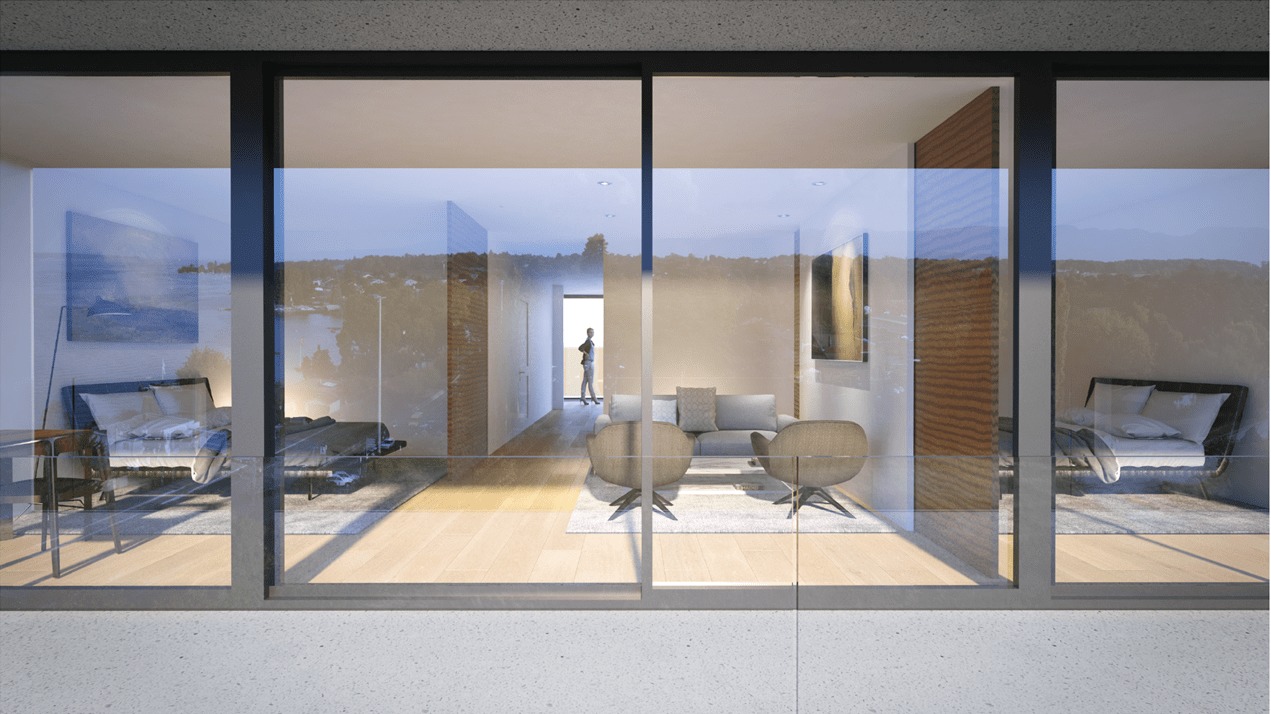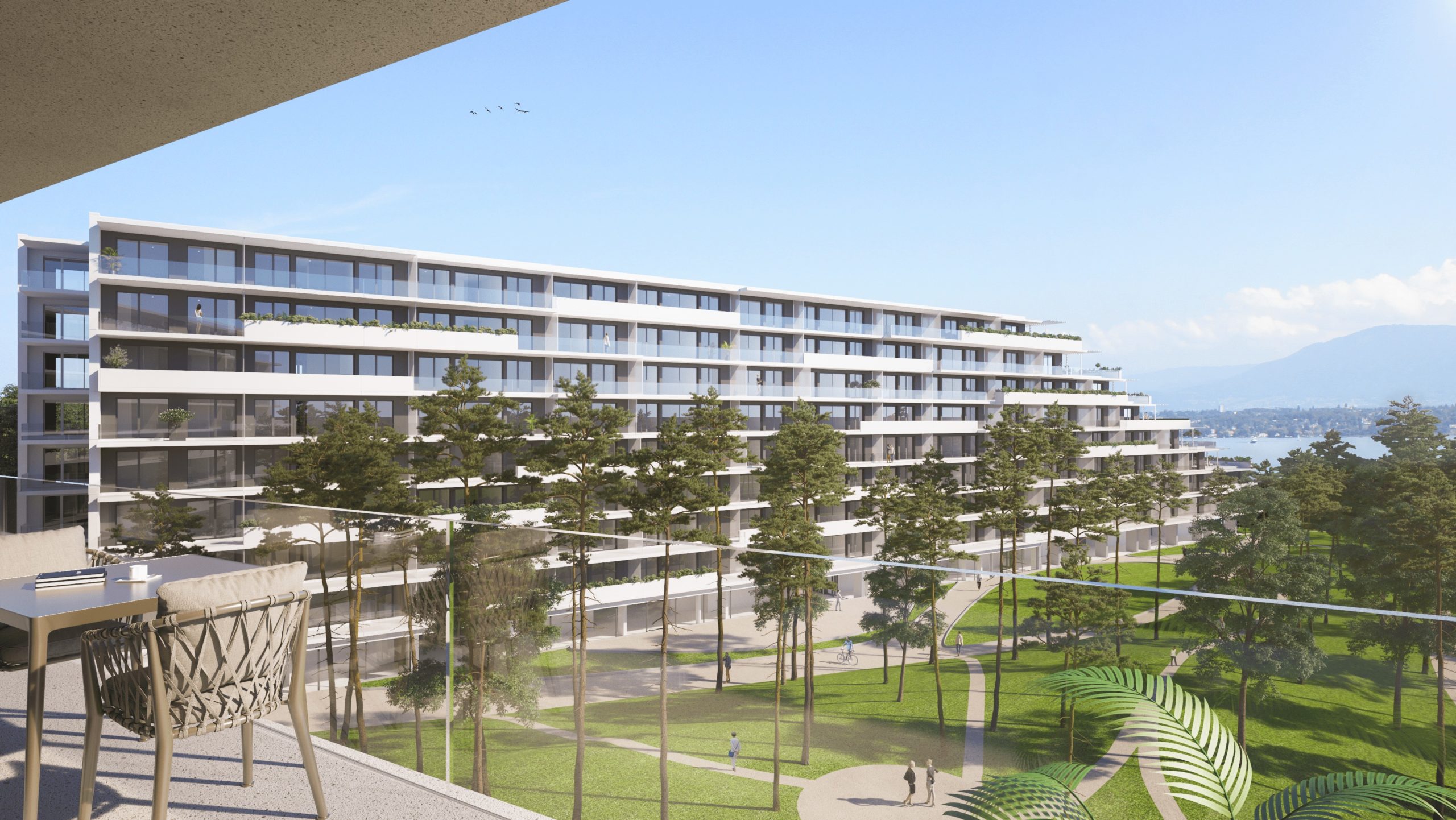vers le lac. Des matériaux comme le béton blanc et le verre ont été privilégiés.