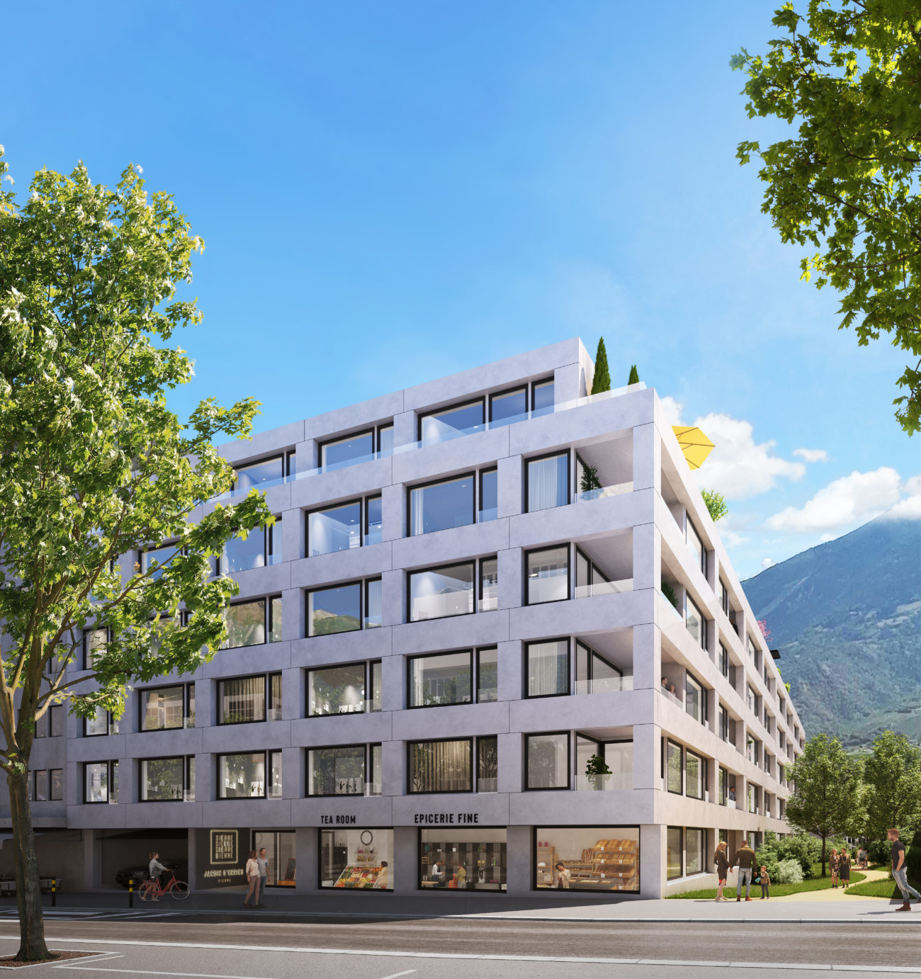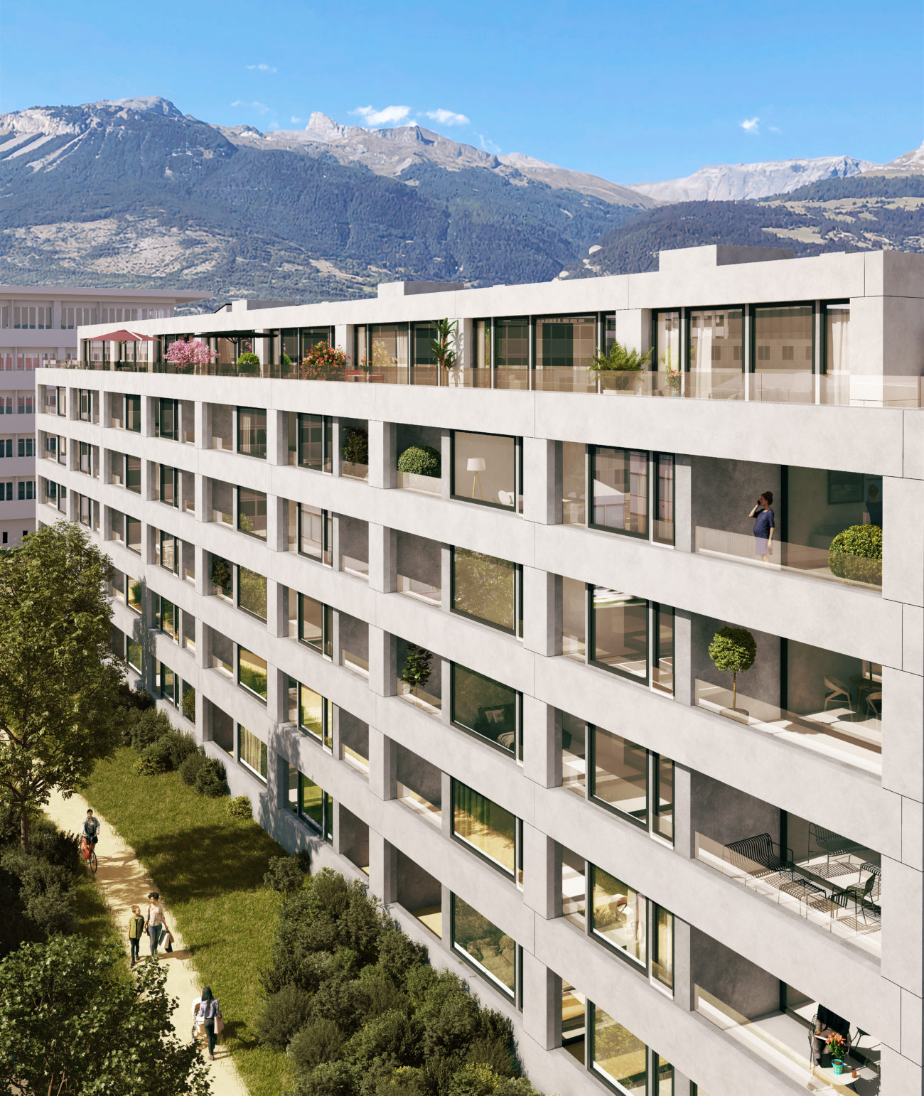 À l’horizon se dessinent 73 appartements, du studio au 4,5 pièces, dans un édifice de 4 étages coiffé d’un attique. Avec des loggias offrant une vue sur Crans-Montana et le Val d’Anniviers, notre bâtiment présente une architecture préservant l’intimité des résidents. Chaque logement, orienté au Sud-Ouest, bénéficie d’un espace extérieur privatif. Un parc public viendra prolonger l’espace de verdure existant de la Villa Papon, créant ainsi des voies piétonnières pour une expérience citadine singulière.