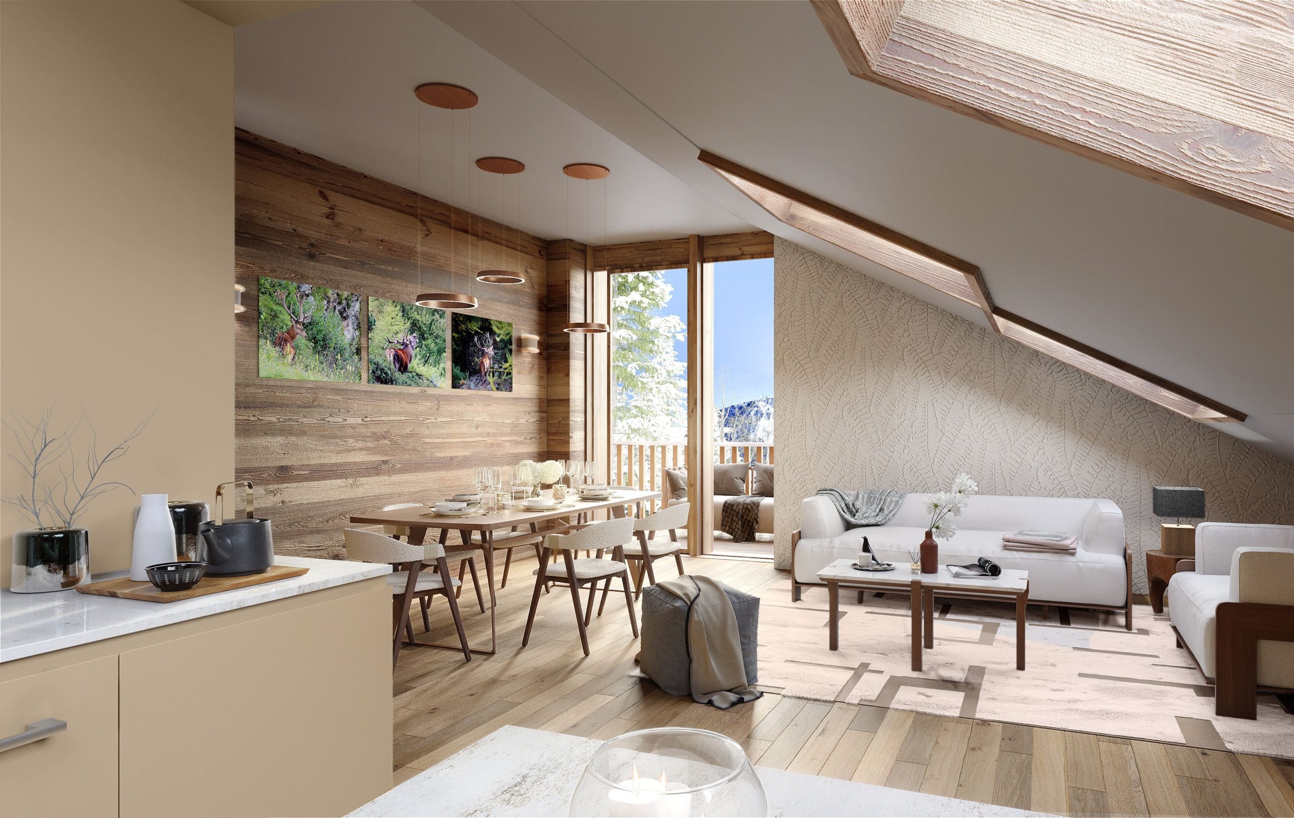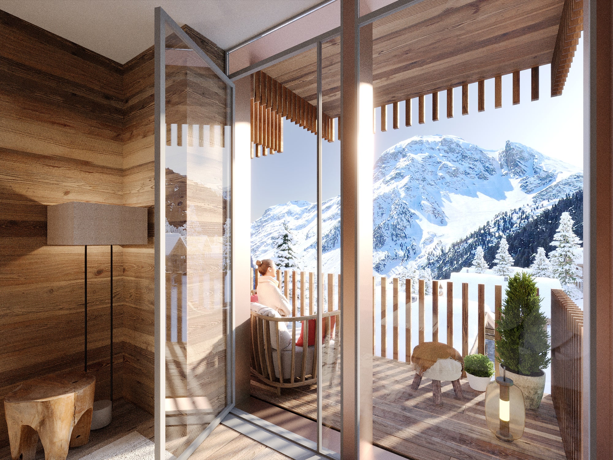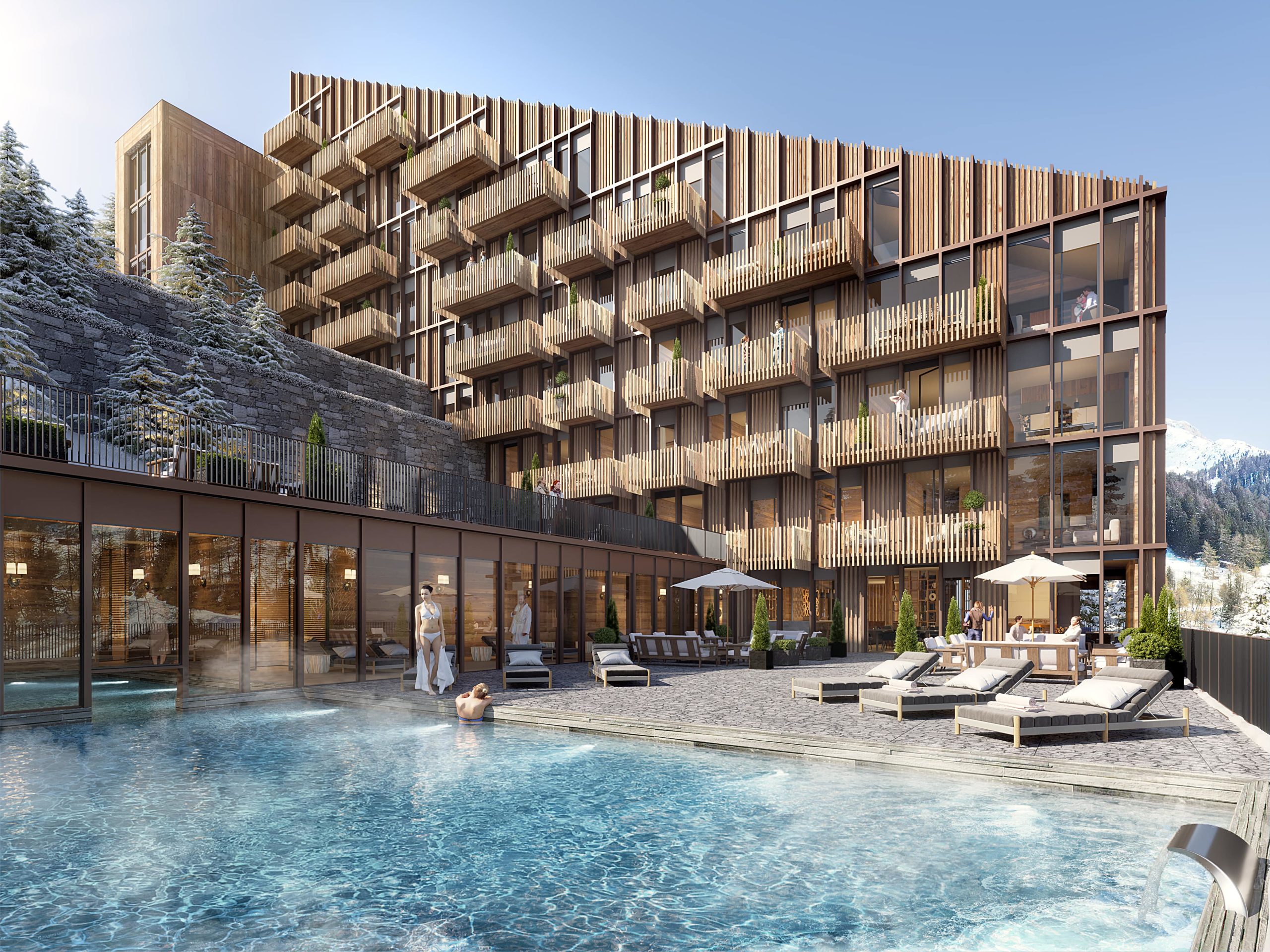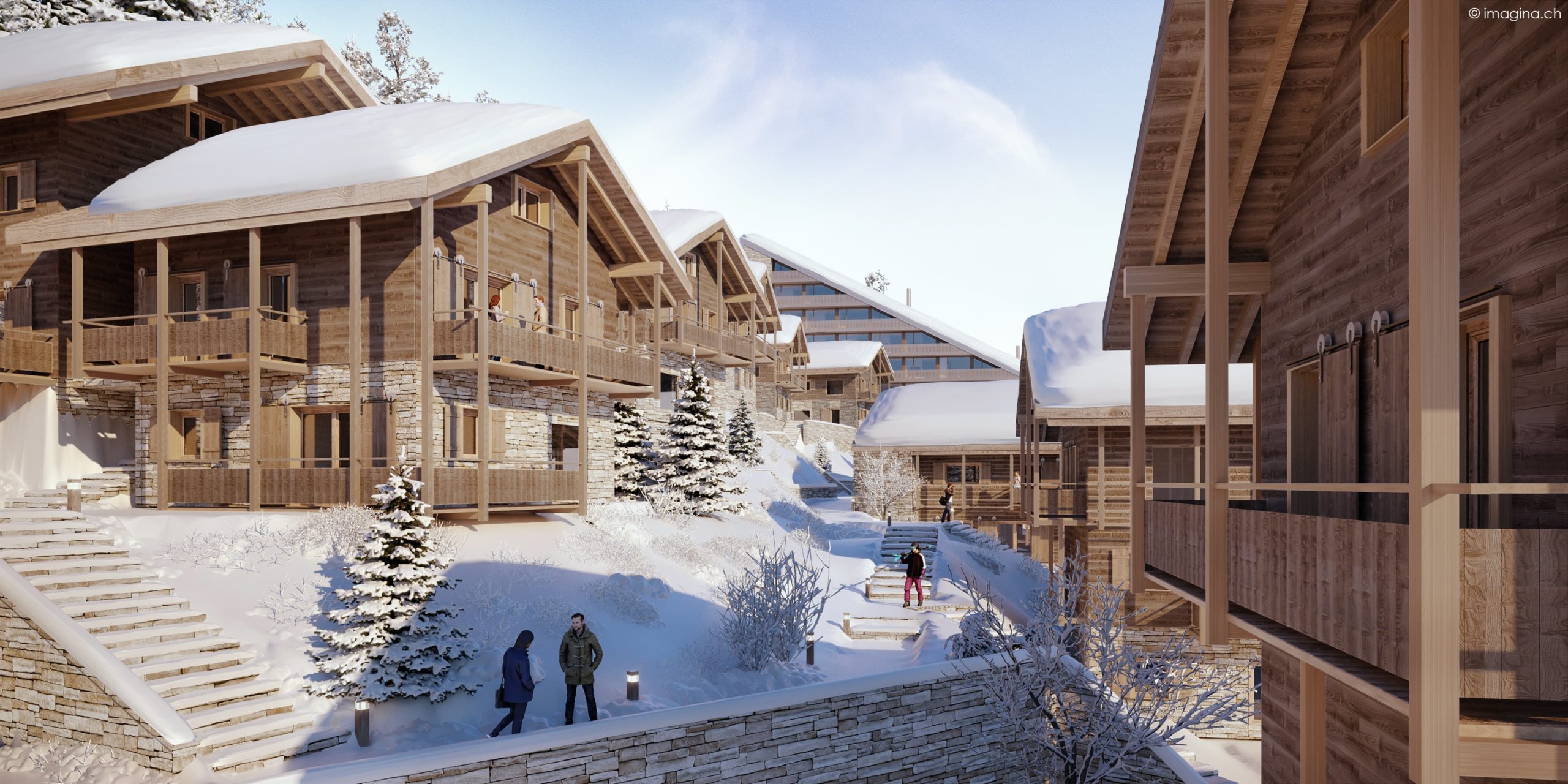 abritera 16 chalets comprenant 48 logements pour une surface de vente globale de 3’720 m2 ainsi qu’un hôtel 4* de 79 chambres avec un design résolument moderne de part sa forme de funiculaire. L’hôtel disposera d’un centre wellness spa, de 65 chambres standards, 9 chambres familiales et de 5 suites ainsi qu’un restaurant avec une terrasse extérieure. Le tout sera complété par un parking souterrain de 107 places et d’une vingtaine de places extérieures.