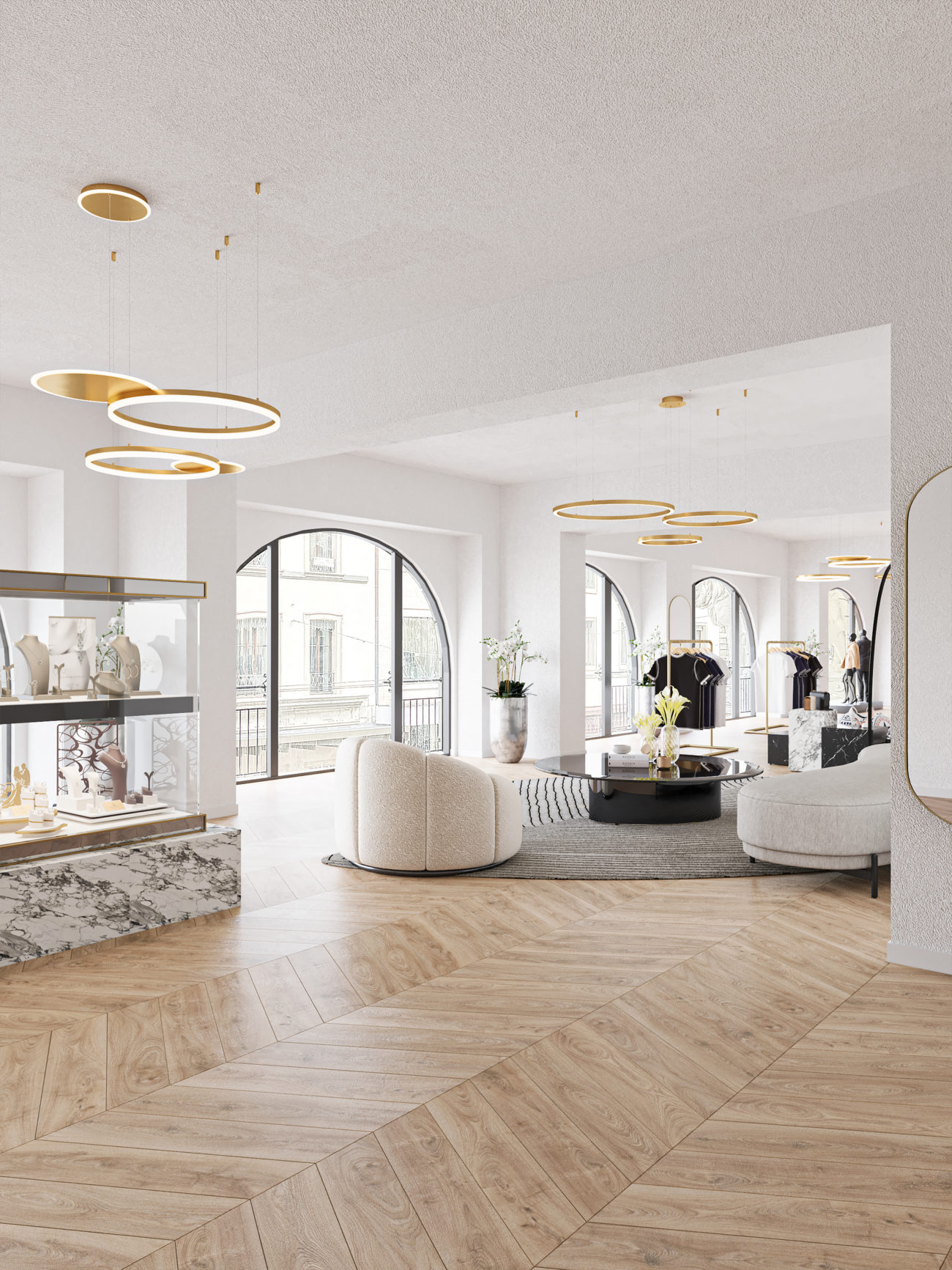 Multiples possibilités d’aménagement : boutiques haut de gamme, showrooms de voitures de luxe, salons de beauté de prestige, etc.