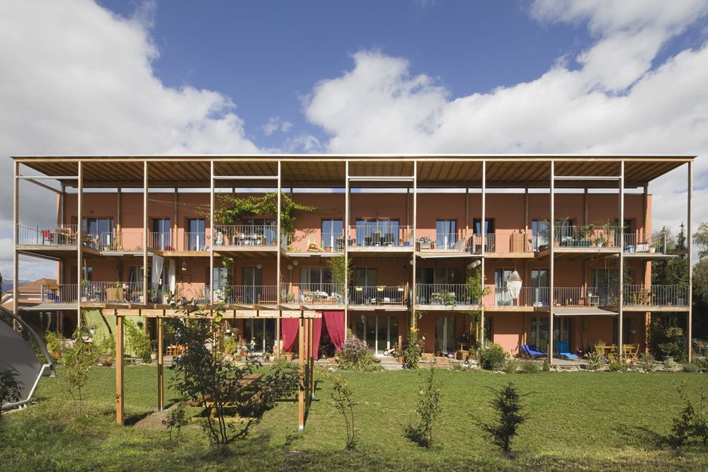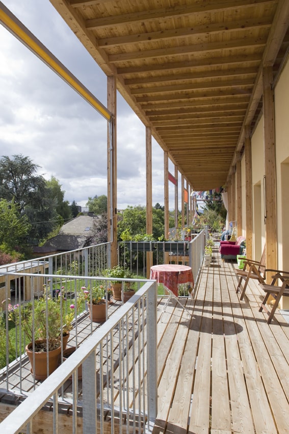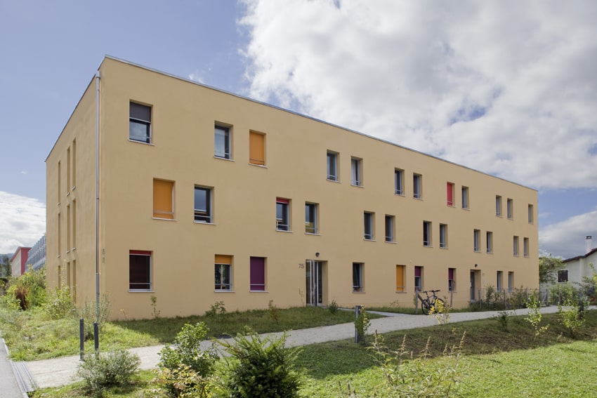 Les murs porteurs et de séparation sont en bois européen tandis que les cages d’escaliers, les sous-sols et les dalles sont en béton armé pour des questions phoniques et feu. Sur le toit, sont installés 150 m2 de panneaux photovoltaïques qui fournissent 20’000 kW/h d’électricité, ce qui couvre pratiquement le 100 % de la consommation de l’ensemble des ménages.