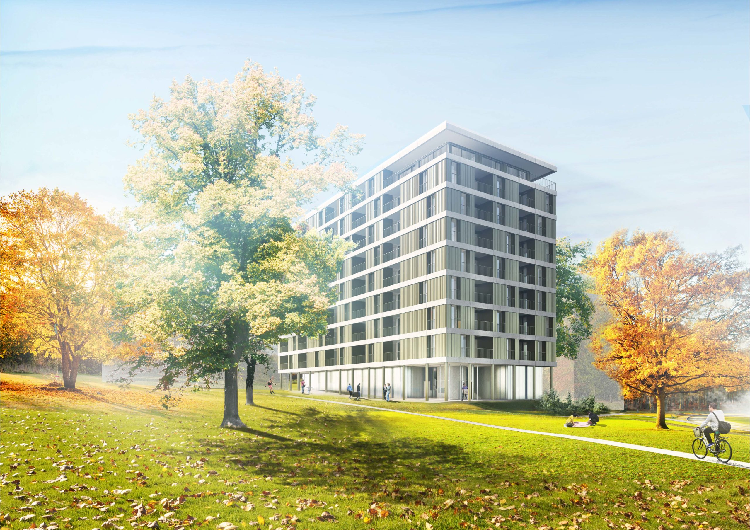 Cet immeuble s’est porté sur une architecture respectueuse de l’environnement et notamment du parc dans lequel il se trouve. Ce choix se retrouve ainsi dans les matériaux mis à l’honneur au niveau de la façade permettant une douce alliance entre transparence et élégance. En adéquation avec les standards de Très Haute Performance Energétique (THPE), des optimisations techniques ont été intégrées afin de garantir une exploitation sur une base d’énergie renouvelable. Un appel à mandat a été réalisé auprès de plusieurs bureaux d’architectes. Le lauréat est l’Atelier d’Architecture Jacques Bugna SA. L’immeuble de 8 étages comprendra 47 logements locatifs.