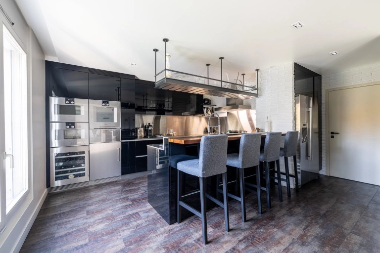 La cuisine moderne et luxueuse, entièrement équipée avec son îlot central, s’intègre harmonieusement aux espaces de réception tout en offrant la possibilité de devenir indépendante, grâce à une configuration permettant de la fermer aisément selon les préférences du nouvel acquéreur.