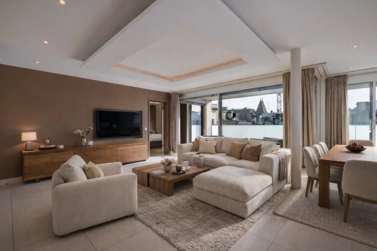 La pièce principale réunit un grand salon, une cuisine ouverte entièrement équipée ainsi qu’un espace salle à manger, offrant un cadre de vie agréable et fonctionnel.