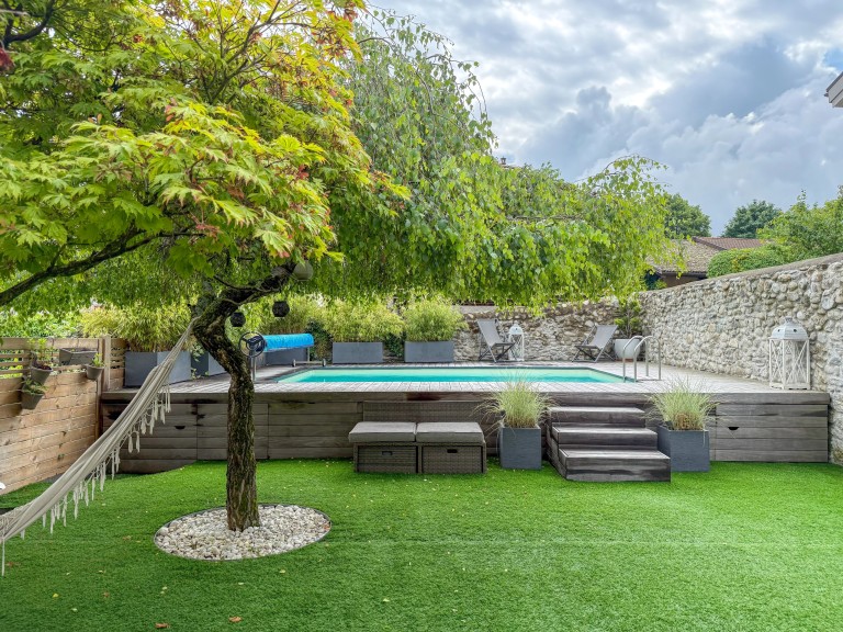 – Jardin privatif clos de 120 m² avec terrasse en bois et piscine hors-sol