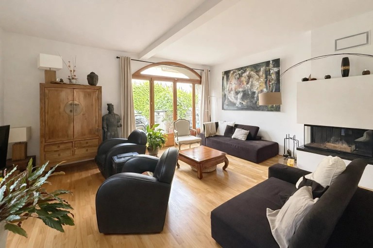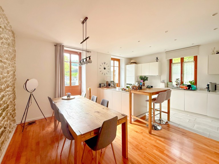Orientée sud, la maison est sublimée par une façade recouverte de glycine, emblème du lieu, et bénéficie d’un calme rare, avec vue dégagée sur la campagne et le Salève. Les matériaux nobles, les poutres apparentes, les murs en pierre et la cheminée Rüegg confèrent un charme unique à cette demeure familiale, prête à accueillir ses nouveaux occupants dès l’été 2025.