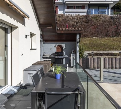 Vous serez séduit par la luminosité de la partie jour de par ses grandes baies vitrées qui s’ouvrent sur une magnifique terrasse avec une superbe vue sur les Dents-du-