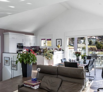 Au rez-supérieur se situe la partie jour avec une cuisine fermée, une salle à manger et un séjour donnant sur une grande terrasse « Sud-Ouest ».