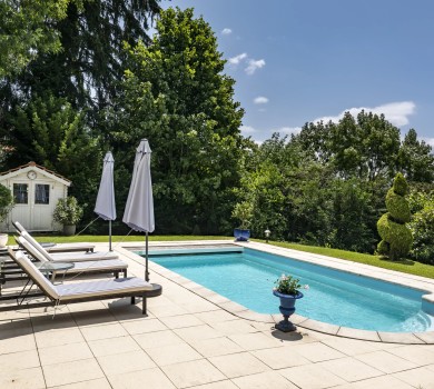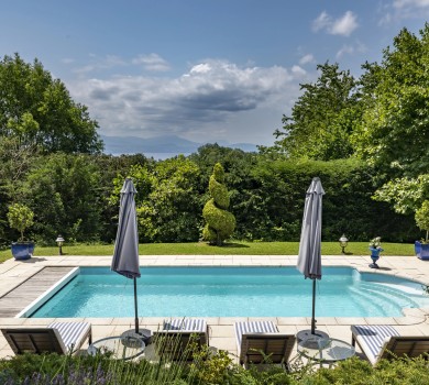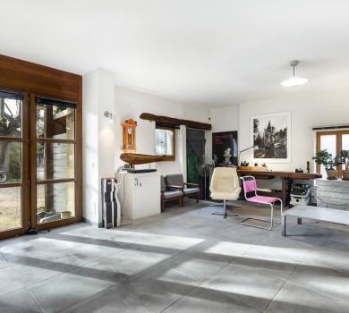 Le salon s’ouvre sur une magnifique terrasse en deck, orientée sud, où s’installe une piscine, idéale pour de superbes moments de détente.